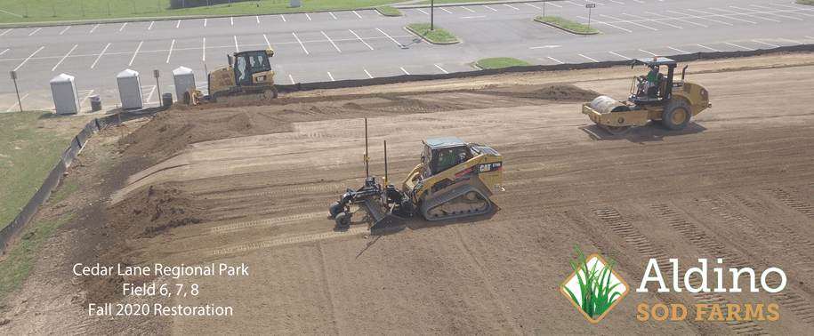 Beginning in 2019, Aldino Sod Farms began a full service field renovation project at Cedar Lane Regional Park. Work includes: design, sediment control measures, laser grading, fine grading, soil amendments, sod installation, watering to establishment, fertilization, and initial mowing and maintenance. E-mail or call our office today to discuss your next renovation project.